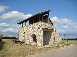 Es folgt ein Anstieg durch die Weinberge. Zwei Wegabzweige zur Rechten ignorieren Sie und passieren kurz darauf das Kreuz der Familie Sieben. Es geht weiter bergan durch die Weinlagen von Harxheim, wobei Sie immer dem Weg folgend alle Abzweige ignorieren. Nach einer leichten Rechtskurve gelangen Sie auf der Anhöhe zu einem netten Aussichtspunkt mit Bänken davor. Kurz danach passieren Sie Joachims Kreuz sowie das Joachimskreuzhäuschen und laufen alle Abzweige ignorierend auf die Kirche von Ebersheim und den Ortsrand zu.