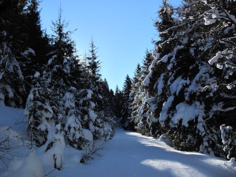 Einen Abzweig links sowie kurz darauf den Abzweig zur Rechten (Buchendom-Erlenweg) ignorieren Sie und folgen weiter dem breiten und gut präparierten Winterwanderweg bergan.